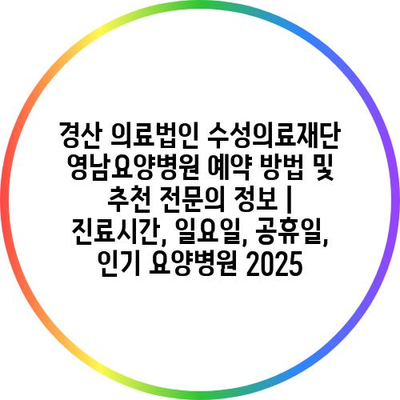 경산 의료법인 수성의료재단 영남요양병원 예약 방법 및 추천 전연락 정보 | 진료시간, 일요일, 공휴일, 인기 요양병원 2025에 대한 내용을 공지합니다.