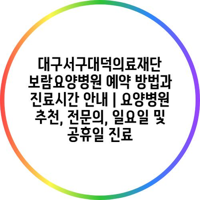 대구서구대덕의료재단 보람요양병원 예약 방법과 진료시간 공지 | 요양병원 추천, 전연락, 일요일 및 공휴일 진료 에 대해 자주 묻는 질문 TOP 5