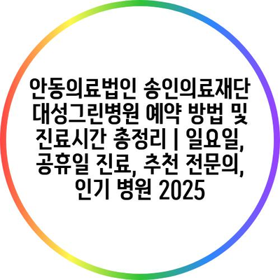안동의료법인 송인의료재단 대성그린병원 예약 방법 및 진료시간 총정리 | 일요일, 공휴일 진료, 추천 전연락, 인기 병원 2025 에 대해 자주 묻는 질문 TOP 5