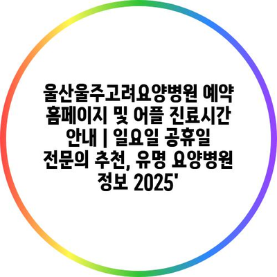 울산울주고려요양병원 예약 홈페이지 및 어플 진료시간 공지 | 일요일 공휴일 전연락 추천, 유명 요양병원 정보 2025′ 에 대해 자주 묻는 질문 TOP 5