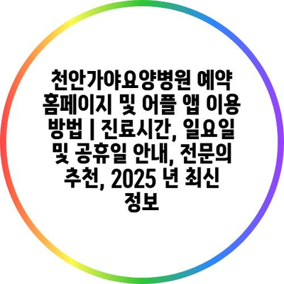 천안가야요양병원 예약 홈페이지 및 어플 앱 이용 방법 | 진료시간, 일요일 및 공휴일 공지, 전연락 추천, 2025 년 최신 정보에 대해 자주 묻는 질문 TOP 5