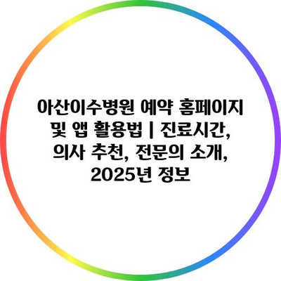 아산이수병원 예약 홈페이지 및 앱 활용법 | 진료시간, 의사 추천, 전문의 소개, 2025년 정보